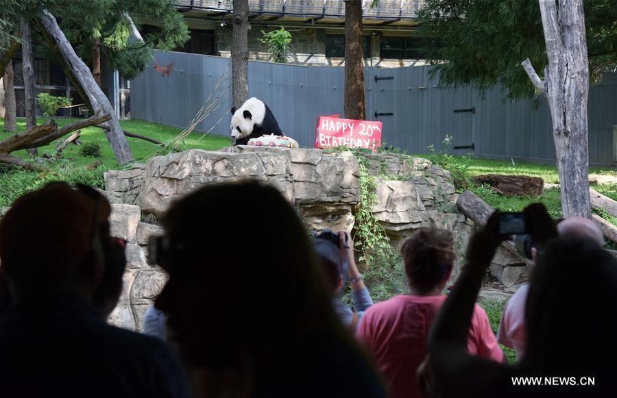 People watch giant panda Tian Tian enjoying birthday cake during a celebration for its 20th birthday at Smithsonian's National Zoo in Washington D.C., the United States, Aug. 27, 2017. The zoo held a celebration on Sunday for giant panda Tian Tian's 20th birthday. (Xinhua/Yin Bogu)
