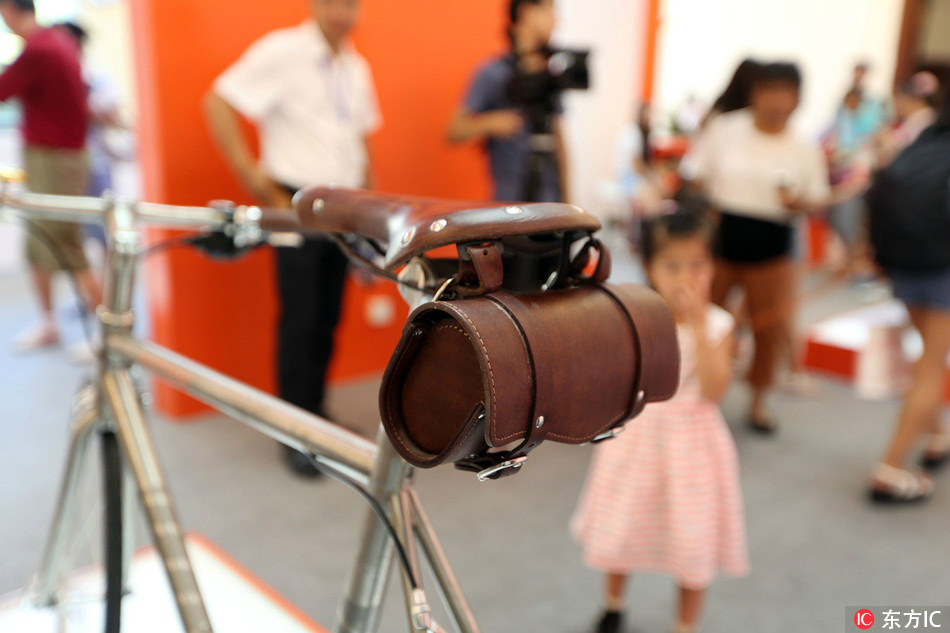 A titanium alloy road bicycle, from Chinese bike-sharing service Mobike, is on display at the 2017 Shanghai Popular Science Products Expo on Friday, August 25, 2017. The Expo features nearly 3,500 exhibits and will come to a close on Monday. [Photo: IC]