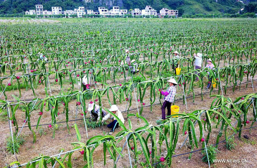 Farmers pluck dragon fruit leaves in Napo Town of Tianyang County, Baise City of south China's Guangxi Zhuang Autonomous Region, Aug. 31, 2017. A group of 23 families are expecting their increased income as they tied a new partnership with a fruit enterprise 3 years ago as share holders. (Xinhua/Zhang Ailin)