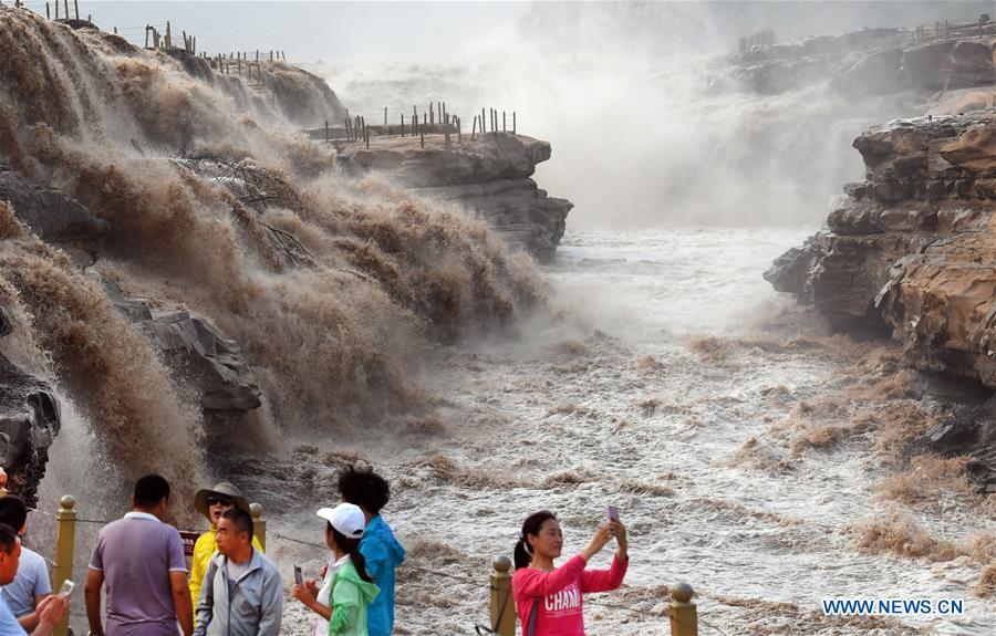 Tourists enjoy scenery of the Hukou Waterfalls along the Yanhuang Highway in Yichuan County, north China's Shaanxi Province, Sept. 3, 2017. The 828.5-kilometer-long Yanhuang Highway, which runs along the west bank of the Yellow River, is expected to play a positive role in promoting the province's local tourism and ecological conservation. At cost of 6.9 billion yuan (1 billion U.S. dollars), the highway across 12 districts and counties will benefit more than 2 million people. (Xinhua/Tao Ming)