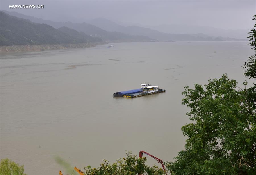 A cargo ship is berthed on the Shawan water of the Three Gorges project in Zigui County, central China's Hubei Province, Sept. 10, 2017. The Three Gorges project started to launch a water storage test to make its water level reach the highest designed mark of 175 meters on Sept. 10, required by China's State Flood Control and Drought Relief Headquarters. The storage is expected to complete at the end of October or on November. (Xinhua/Wang Jiaman)