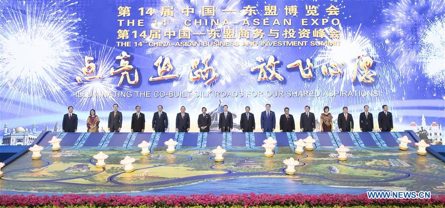 Chinese Vice Premier Zhang Gaoli (8th L) attends the unveiling ceremony for the opening of the 14th China-ASEAN Expo and the China-ASEAN Business and Investment Summit with foreign dignitaries and guests, in Nanning, capital of south China's Guangxi Zhuang Autonomous Region, Sept. 12, 2017. (Xinhua/Wang Ye)