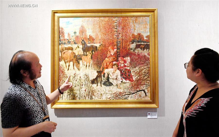 Visitors look at a Russian oil painting during an exhibition of paintings and photos of the BRICS countries in Xiamen, southeast China's Fujian Province, Sept. 15, 2017. The exhibition is a part of one-week BRICS Cultural Festival which kicked off here on Friday. (Xinhua/Lin Shanchuan)