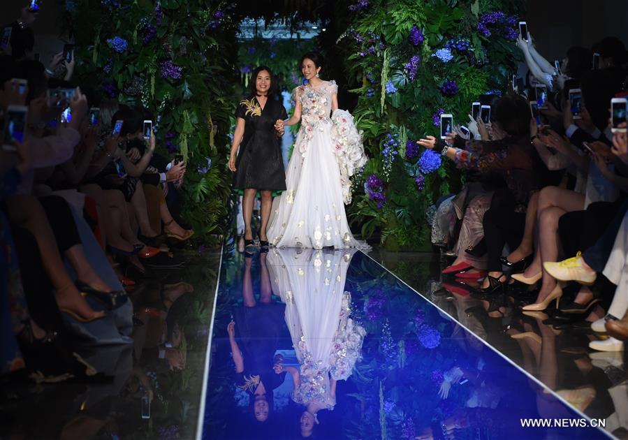 Singer Karen Mok (R) and fashion designer Guo Pei are seen during Guo Pei's Haute Couture fashion show in Beijing, capital of China, Sept. 27, 2017. (Xinhua/Luo Xiaoguang)