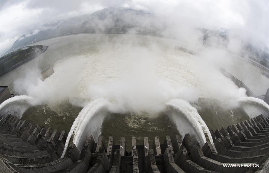 Photo taken on Oct. 5, 2017 shows water discharging from the Three Gorges Dam, a gigantic hydropower project on the Yangtze River, in Yichang City, central China's Hubei Province. (Xinhua/Zheng Jiayu)