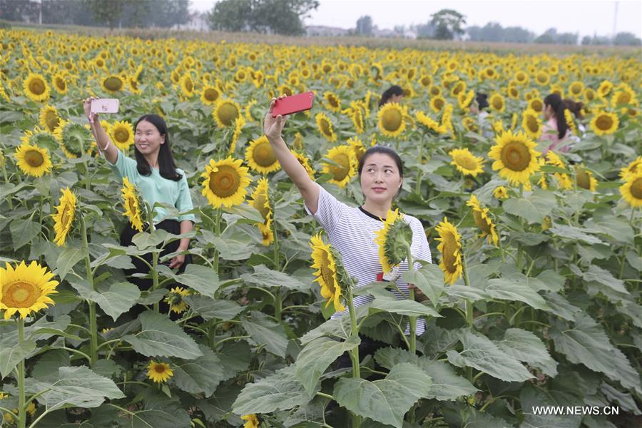 Tourists take selfies among sunflowers in Guanyun County, east China's Jiangsu Province, Oct. 9, 2017. (Xinhua/Wu Chenguang)