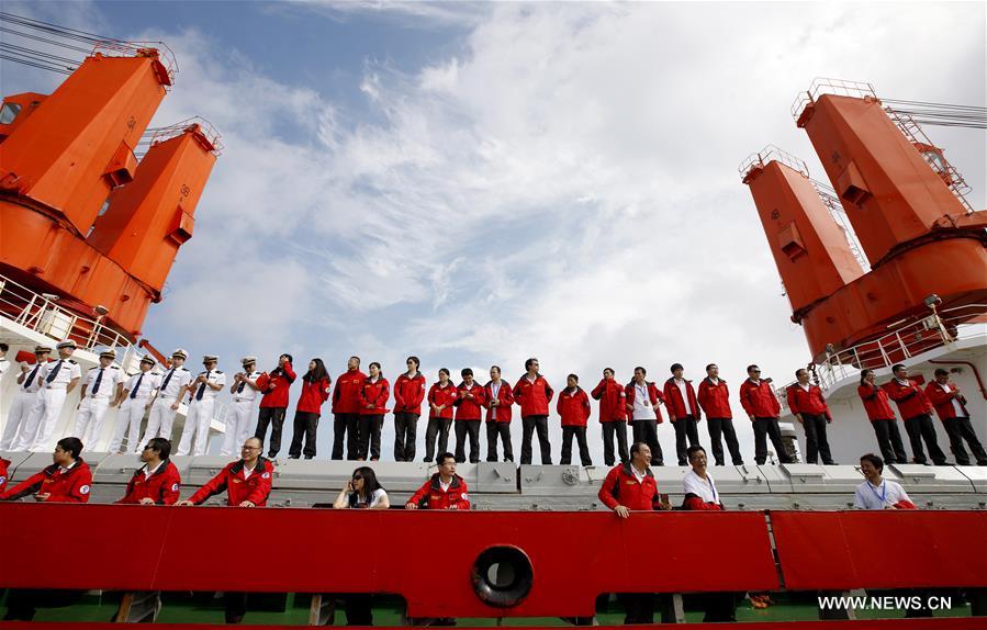 Members of the Chinese scientific expedition team stand on Chinese icebreaker "Xuelong" as they return to Shanghai, east China, Oct. 10, 2017. China's ice breaker, the Xuelong (Snow Dragon) returned to base in Shanghai Tuesday after 83 days on the Arctic rim, completing its eighth Arctic expedition. (Xinhua/Fang Zhe)