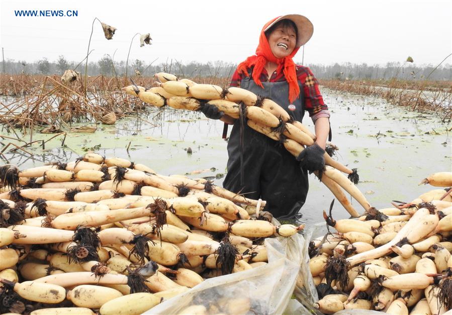 A farmer harvests lotus roots in Lianyungang, east China's Jiangsu Province, Oct. 10, 2017. (Xinhua/Geng Yuhe)