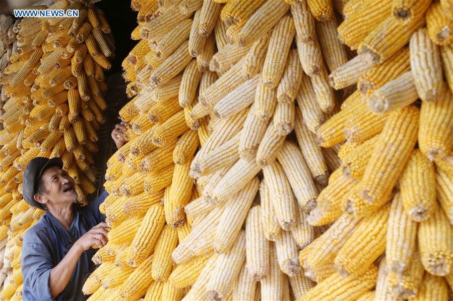 A farmer airs corns in Chongqing, southwest China, Oct. 10, 2017. (Xinhua/Yang Min)