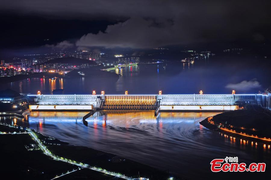 A night view of the illuminated Three Gorges Dam in Yichang City, Central China’s Hubei Province, Oct. 17, 2017. Various lamps have been installed at the massive water conversancy and hydraulic project to increase its night charm. (Photo: China News Service/Li Feng)