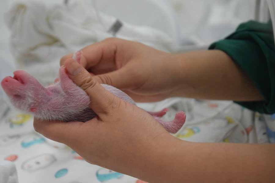 A breeder is checking physical condition of the new-born panda cub. (Photo by CCRCGP)
