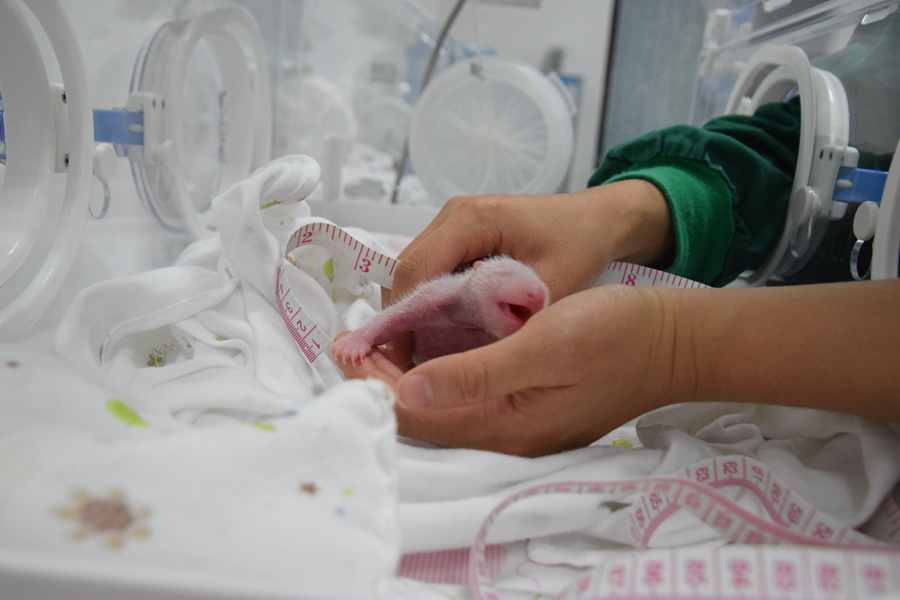 A breeder is measuring length for a new-born panda cub. (Photo by CCRCGP)