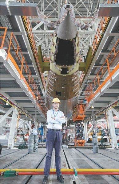 Zhao Junfeng, an engineer at the Commercial Aircraft Corporation of China’s (COMAC) Shanghai Aircraft Design and Research Institute who is in charge of the static tests of the C919, takes a photo with the aircraft. C919 is a large commercial jet that China developed in accordance with international aviation regulations. (Photo by People’s Daily)