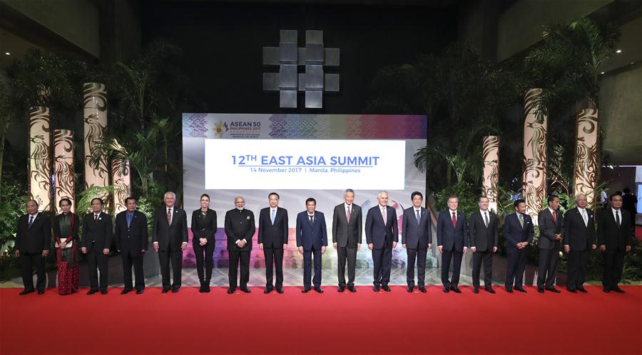Chinese Premier Li Keqiang (8th L) and other leaders attending the 12th East Asia Summit pose for a group photo before the meeting in Manila, Philippines, Nov. 14, 2017. (Xinhua/Pang Xinglei)