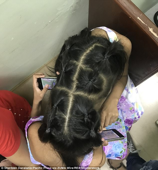 It looks like the girls, 10, have passed the time waiting for medical attention by platting their hair together. (Photo from Mail Online)