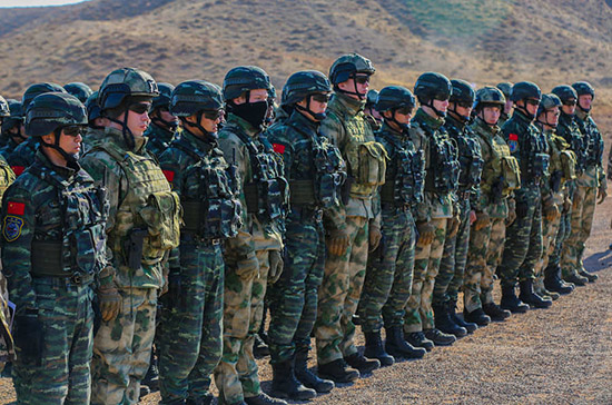 Participating soldiers stand and await orders after arriving at a designated training base during the second day's joint training of the "Cooperation-2017" joint anti-terrorism training between the Chinese People's Armed Police Force (APF) and Russian Federation National Guard on December 4, 2017. (eng.chinamil.com.cn/Photo by Wang Huawei, Wang Tao and Zhou Huancheng)