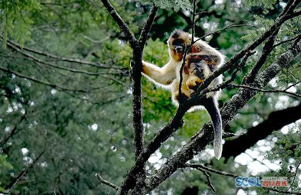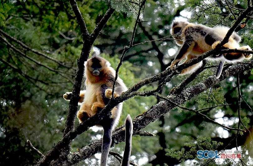 Golden snub-nosed monkeys were spotted on Tuesday looking for food and playing on trees some 100 meters from a village in Baoxing County, Ya’an City, southwest China’s Sichuan province. The monkeys left their mountain habitat to look for food after heavy snow.