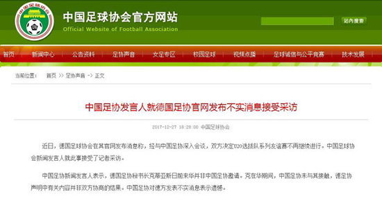 “The German Football Association (DFB) has recently announced that following talks with CFA, both sides agreed to discontinue U20 friendlies. The related contents from DFB were not a result of negotiations,” the Chinese association said in a statement published on its official website.