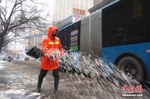 Sanitation workers started work at 3 a.m. to clear snow from the streets in Zhengzhou, capital of central China’s Henan Province, Jan. 4.