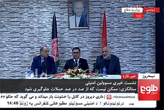 Barmak holds a joint press conference with Defense Minister Tariq Shah Bahrami and the National Directorate of Security (NDS) chief Masoom Stanekzai.(Photo: Local Media)