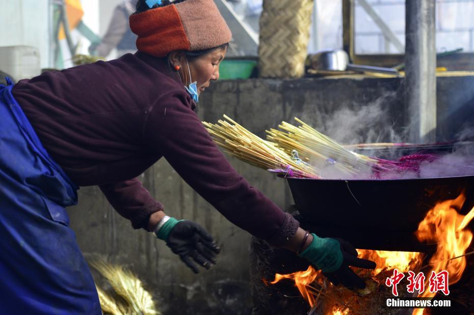 Tibetan handicraftsmen will set up a cauldron before the approaching Tibetan New Year, and color the New Year’s “flowers” in boiling water using dyes from nearby Nepal, Chinanews.com reported on Feb. 9.