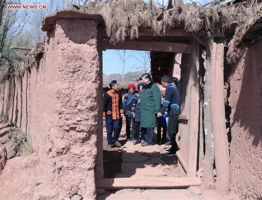 Chinese President Xi Jinping, also general secretary of the Communist Party of China Central Committee and chairman of the Central Military Commission, talks with local officials and villagers as he visits Sanhe Village of Sanchahe Township in Zhaojue County of Liangshan Yi Autonomous Prefecture, southwest China's Sichuan Province, Feb. 11, 2018. Xi made an inspection tour in Sichuan and extended greetings ahead of the Spring Festival, which falls on Feb. 16 this year. (Xinhua/Xie Huanchi)
