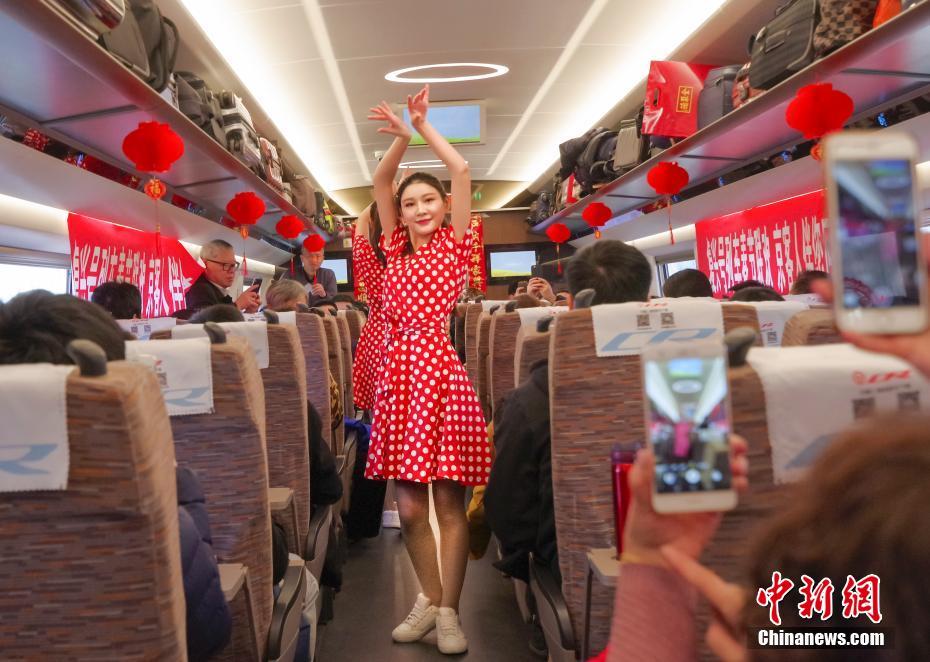A party was held on Fuxing high-speed train heading to Shanghai from Beijing on Feb. 13 to celebrate the upcoming Chinese New Year. It was the maiden run for Fuxing locomotives in the annual Spring Festival travel rush.