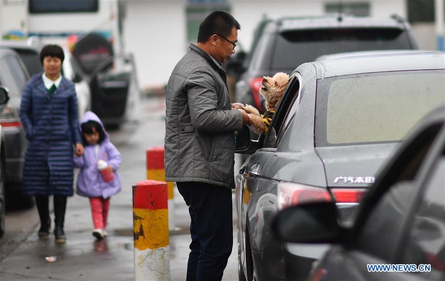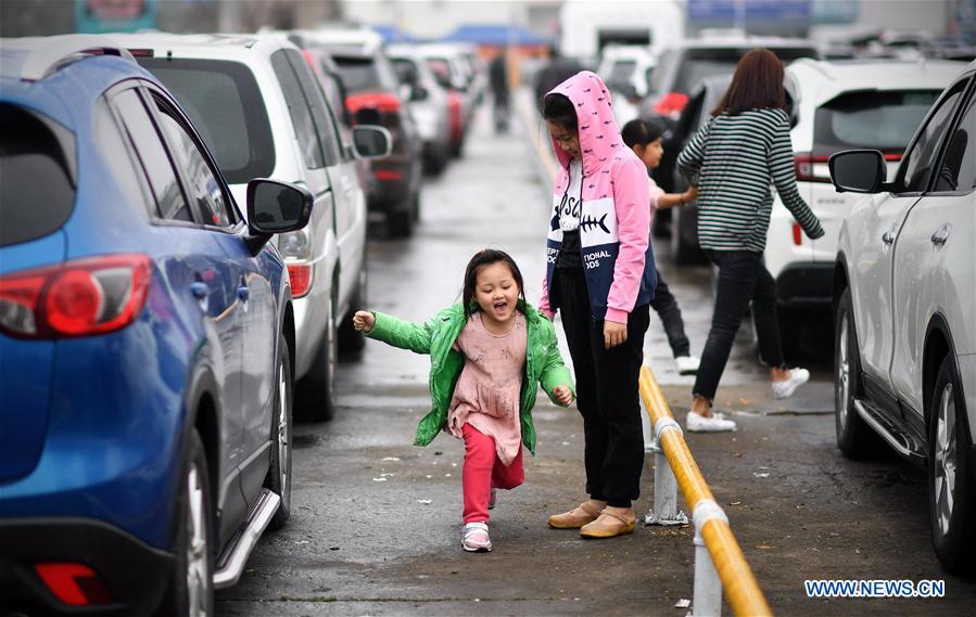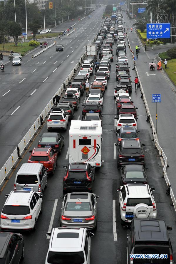 Tourists wait for ferries at a port in Haikou, capital of south China's Hainan Province, Feb. 23, 2018. More than 12,000 vehicles returning home from a week-long break remained stuck in a seemingly endless traffic jam for ferries in Hainan Province as of Friday afternoon. (Xinhua/Guo Cheng)