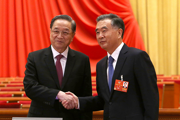 Wang Yang (right), a member of the Standing Committee of the Political Bureau of the CPC Central Committee who will preside over the first session of the 13th Chinese People's Political Consultative Conference National Committee, shakes hands in Beijing on Friday with Yu Zhengsheng, chairman of the 12th CPPCC National Committee. [Photo/China Daily by Zou Hong]