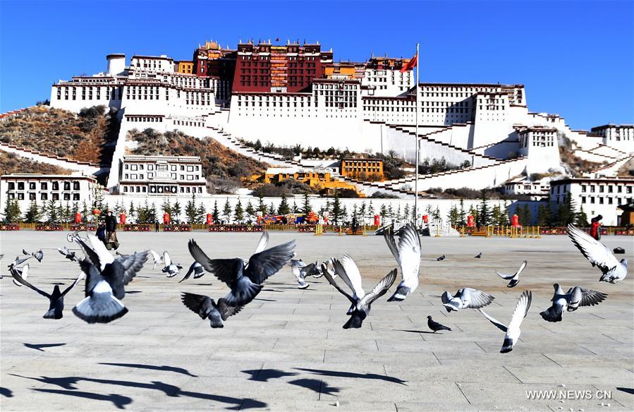 Doves are seen at the Potala Palace in Lhasa, capital of southwest China's Tibet Autonomous Region, March 4, 2018, as the weather warms up recently. (Xinhua/Chogo)