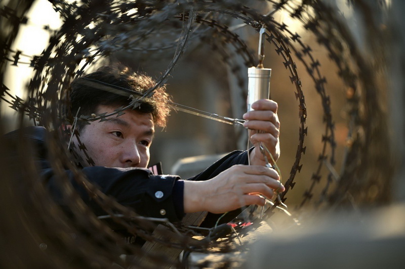 Hao Zhishan, head of police office at Xinxiang East railway station, installs an intrusion detection system, Feb. 3, 2018. The system, hailed as “electric mine”, has evolved into the third generation and won the national patent. (Photo from CFP)