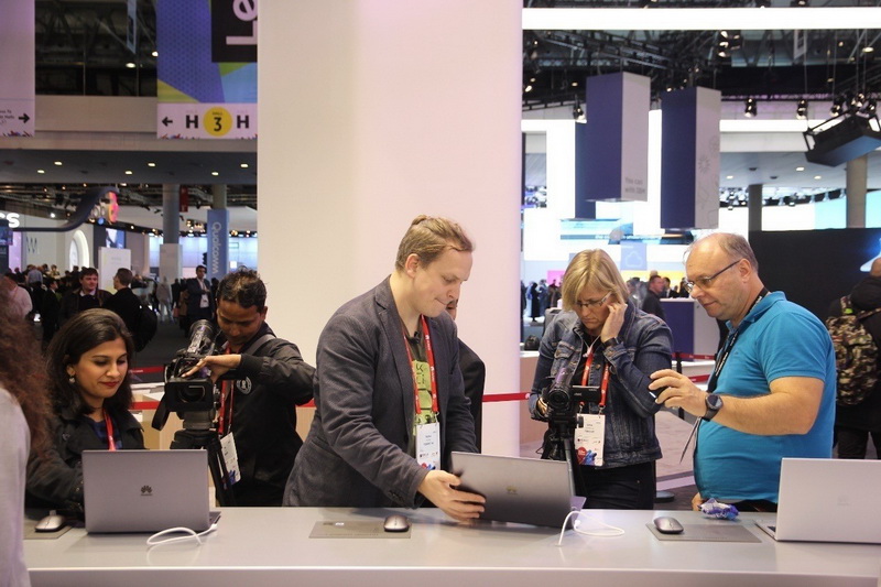 Reporters covering the Mobile World Congress, which kicked off in Barcelona, Spain, Feb. 26, 2018, take photos of the newest laptop exhibited by Chinese manufacturer Huawei. China-made products had a eye-catching performance during the event. (Photo by Jiang Bo from People’s Daily)