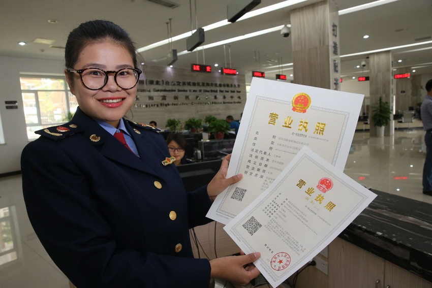 A staff from a local industry and commerce administration in Hubei province shows the province’s first business licenses that combine nine certificates into one at an administrative service center in China (Hubei) Pilot Free Trade Zone, May 12, 2017. (Photo from CFP)