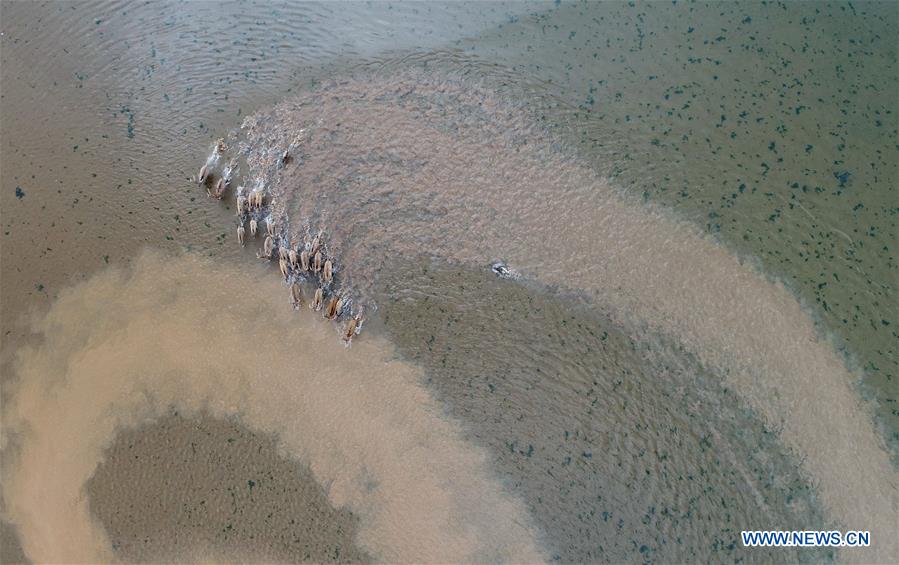 This aerial photo taken on April 3, 2018 shows a herd of galloping milu deer in the wetland around Poyang Lake in east China's Jiangxi Province. China Tuesday released 47 rare milu deer into the wild in the wetland around Poyang Lake to improve biodiversity and protect the ecosystem of the country's largest freshwater lake. (Xinhua/Zhou Mi)