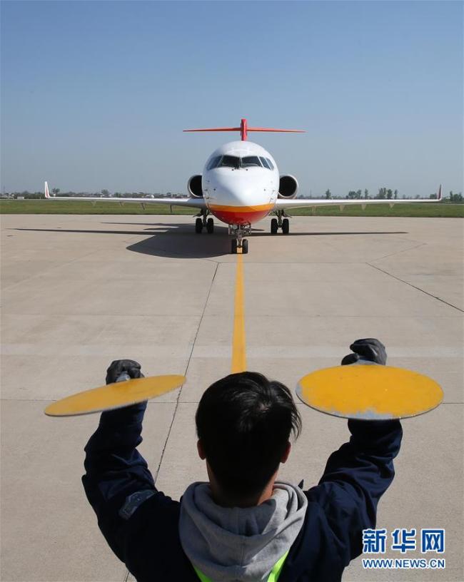 An ARJ21-700 aircraft lands at Yanliang airport in Xi'an, Shaanxi Province, on April 8, 2018. [Photo: Xinhua]