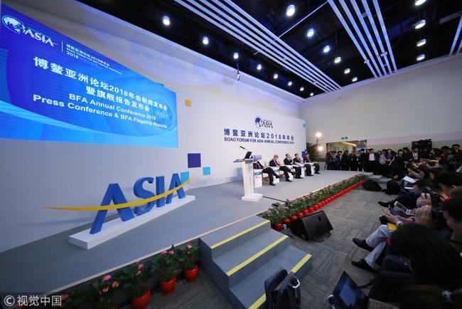 A report is released by the Boao Forum for Asia (BFA) in Boao Town, South China's Hainan province, April 8, 2018. The Boao Forum for Asia annual conference will last from April 8 to April 11.[Photo: VCG]