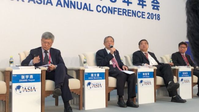 Zhou Wenzhong (Second from the left), secretary-general of the Boao Forum for Asia (BFA), speaks at a press conference in Boao Town, South China's Hainan province, April 8, 2018. [Photo: China Plus]