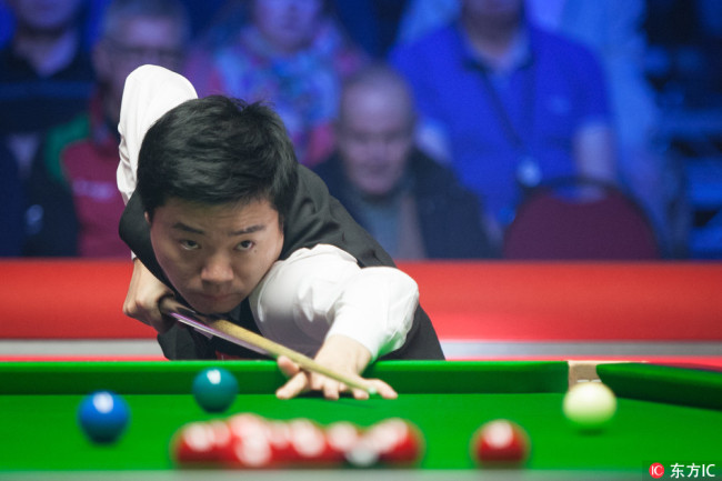 Ding Junhui plays a shot to Ronnie O'Sullivan of England in the quarterfinal match during the 2018 Ladbrokes Players Championship snooker tournament in Llandudno, Wales, UK, March 21, 2018. [Photo: IC]