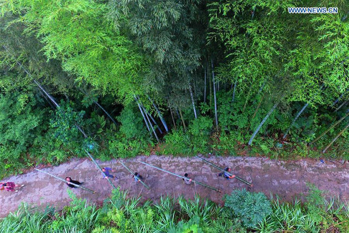 Villagers carry bamboos with wine in it at Daliu Village, Longji Town, Longsheng County, south China's Guangxi Zhuang Autonomous Region, May 30, 2018. Best known for its rich bamboo materials, Longji has developed bamboo wine industry in recent years. The bamboo wine, usually taking three or four months for brewing in growing bamboos, is popular here. (Xinhua/Huang Yongdan)