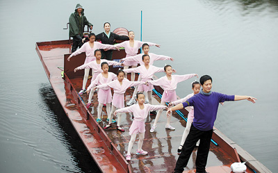 Guan Yu (front) and his students dance on a boat.