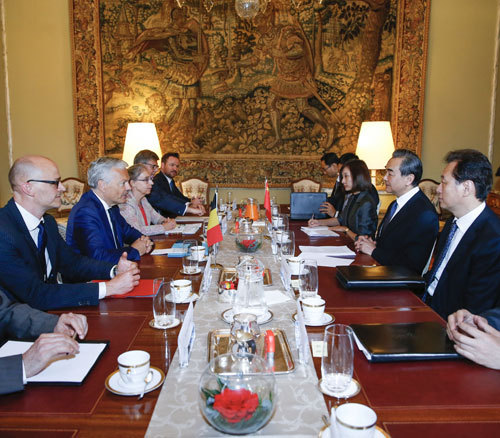 Visiting Chinese State Councilor and Foreign Minister Wang Yi met with Belgian Deputy Prime Minister and Foreign Minister Didier Reynders at the Egmont Palace in Brussels.