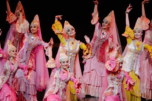 Next came the Kazakhstan dance Arular, which means "beauties" in Kazakh. The dance conveyed the beauty, elegance and gentleness of Kazakh girls. With subtle and graceful steps, dancers dressed in rose-colored traditional ethnic clothing, headdresses and transparent veils highlighted the uniqueness of the dance with gentle movement of their hands, body and head.