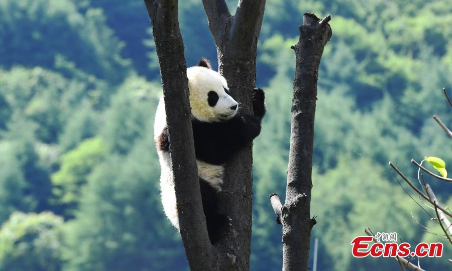 Photo taken on June 10, 2018 shows a giant panda born this year at the China Conservation and Research Center for the Giant Panda plays on a sunny day. (Photo: China News Service/An Yuan)