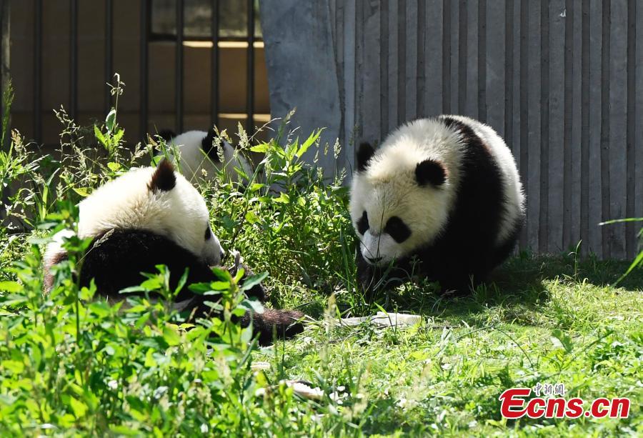 Photo taken on June 10, 2018 shows a giant panda born this year at the China Conservation and Research Center for the Giant Panda plays on a sunny day. (Photo: China News Service/An Yuan)