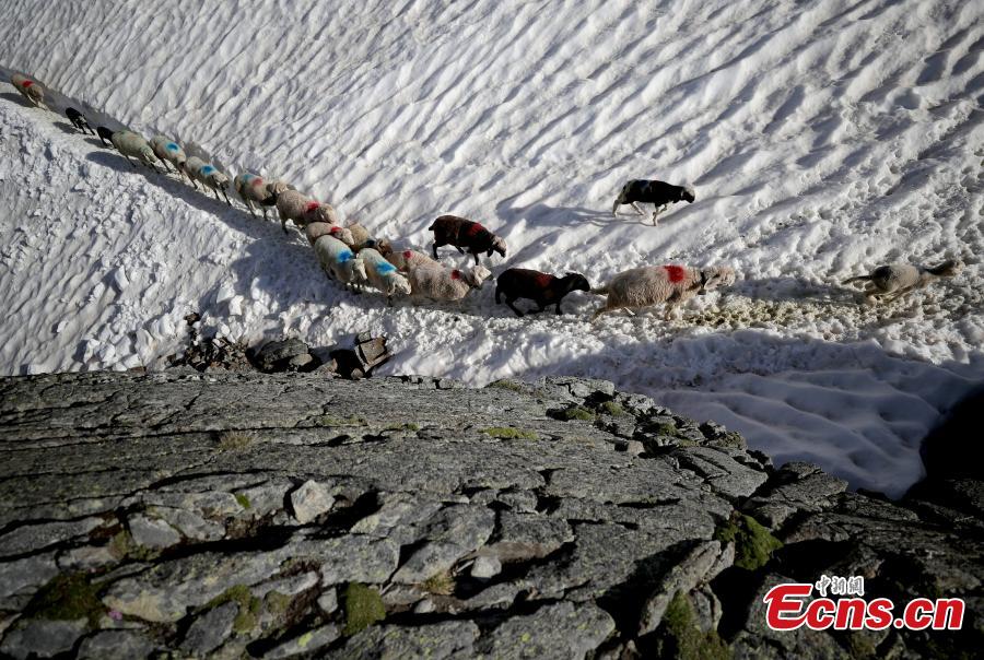 Sheep cross the alpine pass "Hochjoch" at 2,856 meters above sea level, in the autonomous region of South Tyrol, Italy, June 9, 2018. (Photo/Agencies)
