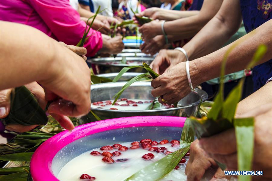 Residents make Zongzi, a pyramid-shaped dumpling made of glutinous rice wrapped in bamboo or reed leaves, to greet the upcoming Dragon Boat Festival at a community in Yongqing County, north China's Hebei Province, June 13, 2018. (Xinhua/Li Xiaoguo)