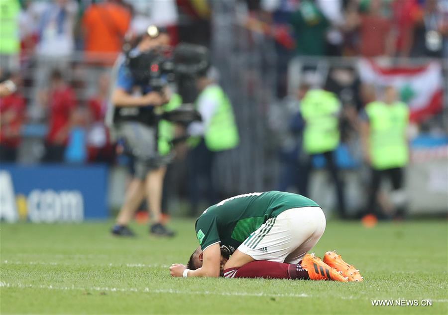 Javier Hernandez of Mexico celebrates victory after a group F match between Germany and Mexico at the 2018 FIFA World Cup in Moscow, Russia, June 17, 2018. Mexico won 1-0. (Xinhua/Xu Zijian)