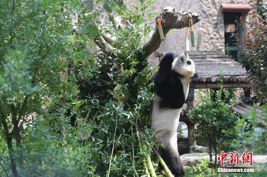 Pandas living in Jinan Zoo, east China’s Shandong province, climbed up to reach the zongzi that had been placed in bamboo tubes for them to enjoy. Zongzi is a sticky rice specialty served on China’s Dragon Boat Festival Day which fell on June 18, Chinanews.com reported on Tuesday.