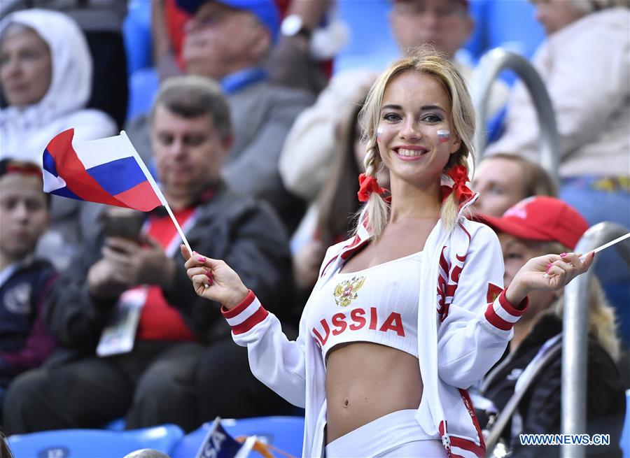 A fan of Russia reacts prior to a Group A match between Russia and Egypt at the 2018 FIFA World Cup in Saint Petersburg, Russia, June 19, 2018. (Xinhua/Chen Yichen)