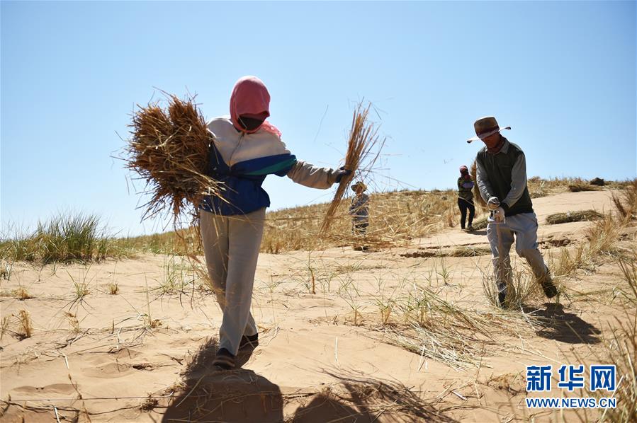 Photo shows workers making straw checkerboard sand barriers in the Tengger Desert, June 11, 2018. Photo from Xinhua
